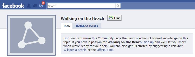 - Community pages – Information pages about a topic, cause or experience. They won’t generate stories in your News Feed, and won’t be maintained by a single author. If automatically crested by Facebook, they display the Community Page logo (above), and if available, a Wikipedia picture and an info section from Wikipedia. Related posts from other people on Facebook will also be displayed in real time. If Facebook can’t find the right article from Wikipedia, there may be messaging on these Community Pages inviting users to sign up to contribute in the future.