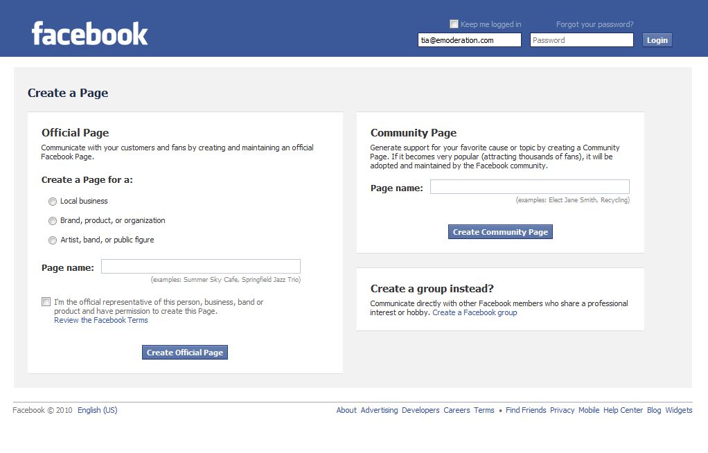 - Official pages (what used to be called Fan Pages) – Pages can only be created to represent a real organization, business, celebrity, or band, and may only be created and maintained by an official representative. If a pages gets very big, Facebook requests authorisation details to check it’s really run by a brand representative and may delete them if not.